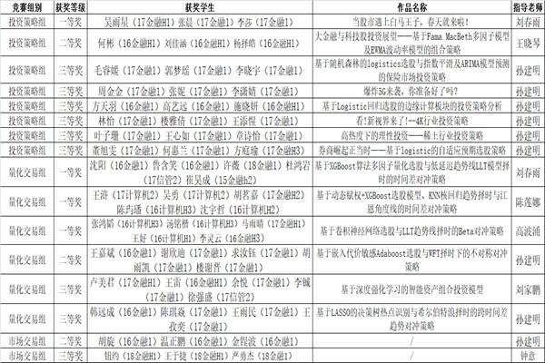 在竞赛投资策略组中,吴雨星等学生团队项目《当股市遇上白马王子,春天就来啦!》荣获一等奖;何彬等学生团队项目获得二等奖;毛睿媛等学生团队、周金金等学生团队、方天羽等学生团队、林怡等学生团队、叶子珊等学生团队和董旭雯等学生团队项目获三等奖。量化交易组中,沈阳等学生团队项目《基于XGBoost算法多因子量化选股与低延迟趋势线LLT模型择时的时间差对冲策略》、王浒等学生团队项目《基于动态赋权+XGBoost选股模型、KNN核回归趋势择时与江恩角度线的时间差对冲策略》和张鸿韬等学生团队项目《基于卷积神经网络选股与LLT趋势线择时的Beta对冲策略》均荣获一等奖;王嘉斌等学生团队的项目获二等奖;卢美君等学生团队和韩远成等学生团队项目荣获三等奖。市场交易组中,胡旋等学生团队荣获二等奖,钮约等学生团队荣获三等奖。