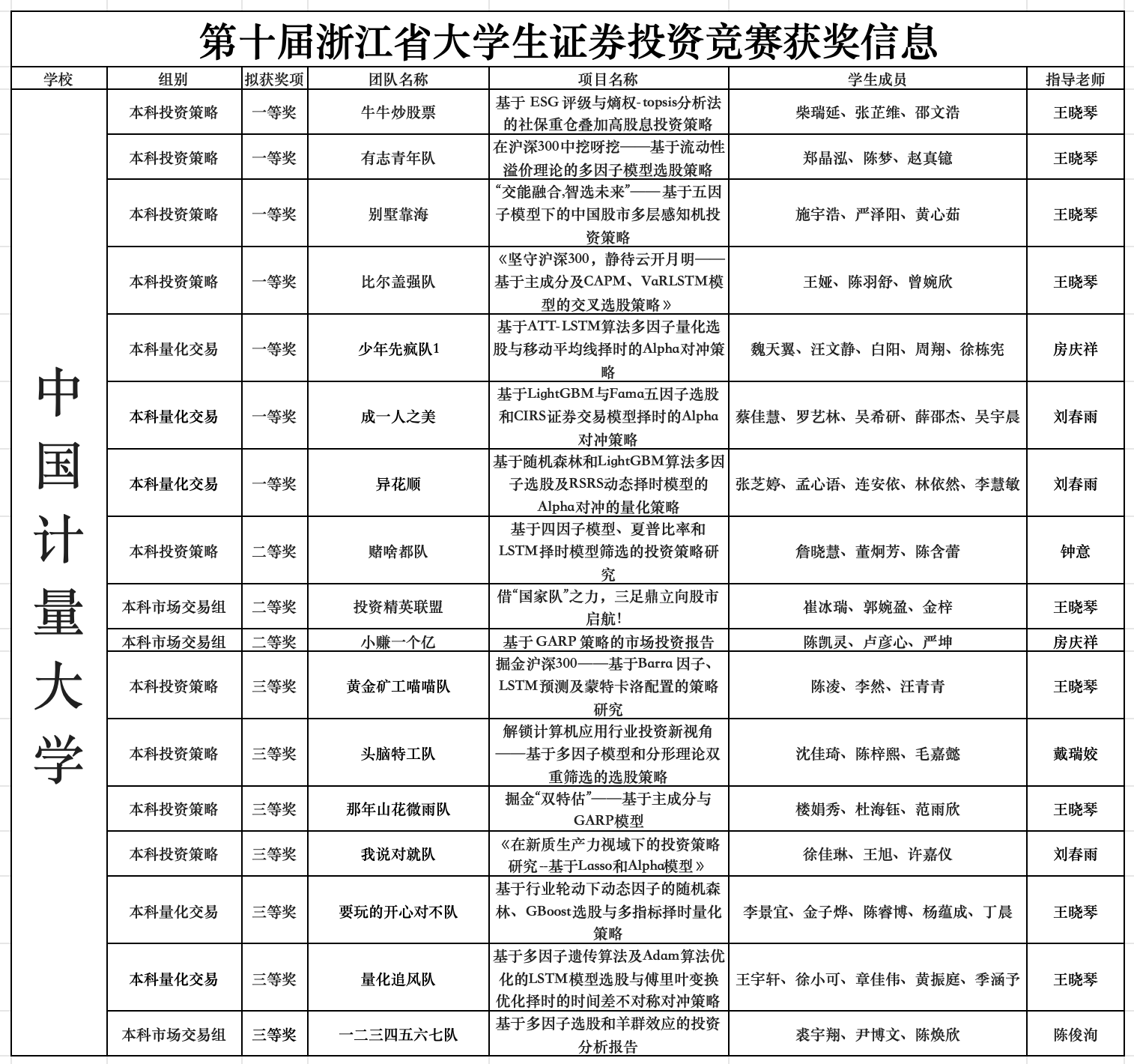 11月16日,由浙江省大学生科技竞赛委员会主办,浙江财经大学、杭州师范大学、浙江省大学生证券投资竞赛委员会承办,浙商证券股份有限公司、浙江核新同花顺网络信息股份有限公司协办的第十届浙江省“浙商证券同花顺杯”大学生证券投资竞赛落下帷幕。本次竞赛自今年启动以来,共有来自全省78所学校的1312支团队参赛,其中,本科组团队竞赛分为投资策略组、量化交易组和市场交易组三个组别。我校学生获得省一等奖7项、省二等奖3项、省三等奖7项,获奖数量及质量位名列前茅。