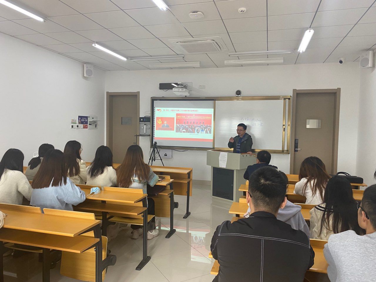学院党委副书记陈骅化身讲解员,结合同学们的实际,先后从报告的主要内容、重要意义以及同学们应如何不负新时代,奋斗新征程对党的二十大报告进行了解读。“大家要坚定不移听党话、跟党走,怀抱梦想又脚踏实地,敢想敢为又善作善成。”陈骅寄语在场青年学生,不仅要迅速掀起学习宣传贯彻党的二十大精神热潮,而且要在全面学习、全面把握、全面落实上下工夫;要时刻牢记党员、团员身份,在学习宣传贯彻党的二十大精神方面走在前,带头学习,先学一步,学深悟透,通过学习,坚定理想信念,坚定不移听党话跟党走,立志做有理想、敢担当、能吃苦、肯奋斗的新时代好青年。
