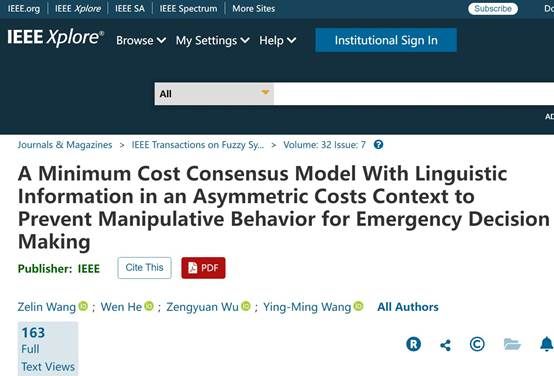 近日,经管学院王泽林博士团队围绕群体共识决策,在国际顶级期刊IEEE Transactions on Fuzzy Systems发表题为“A minimum cost consensus model with linguistic information in an asymmetric costs context to prevent manipulative behavior for emergency decision making”的学术论文。王泽林博士为第一作者,吴增源副教授为通讯作者,第一作者和通讯作者署名单位均为中国计量大学。