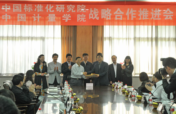 2012年10月24日,我校在闻厅举行了“中国标准化研究院与中国计量学院战略合作推进会”,中国标准化研究院马林聪院长与林建忠校长共同签署了推进战略合作备忘录。“相信双方能够在人才培养、标准化教育、科学研究、社会服务方面进一步提升合作水平、深化层次,为我国标准化体系的建设作出我们的贡献。”林建忠表示。