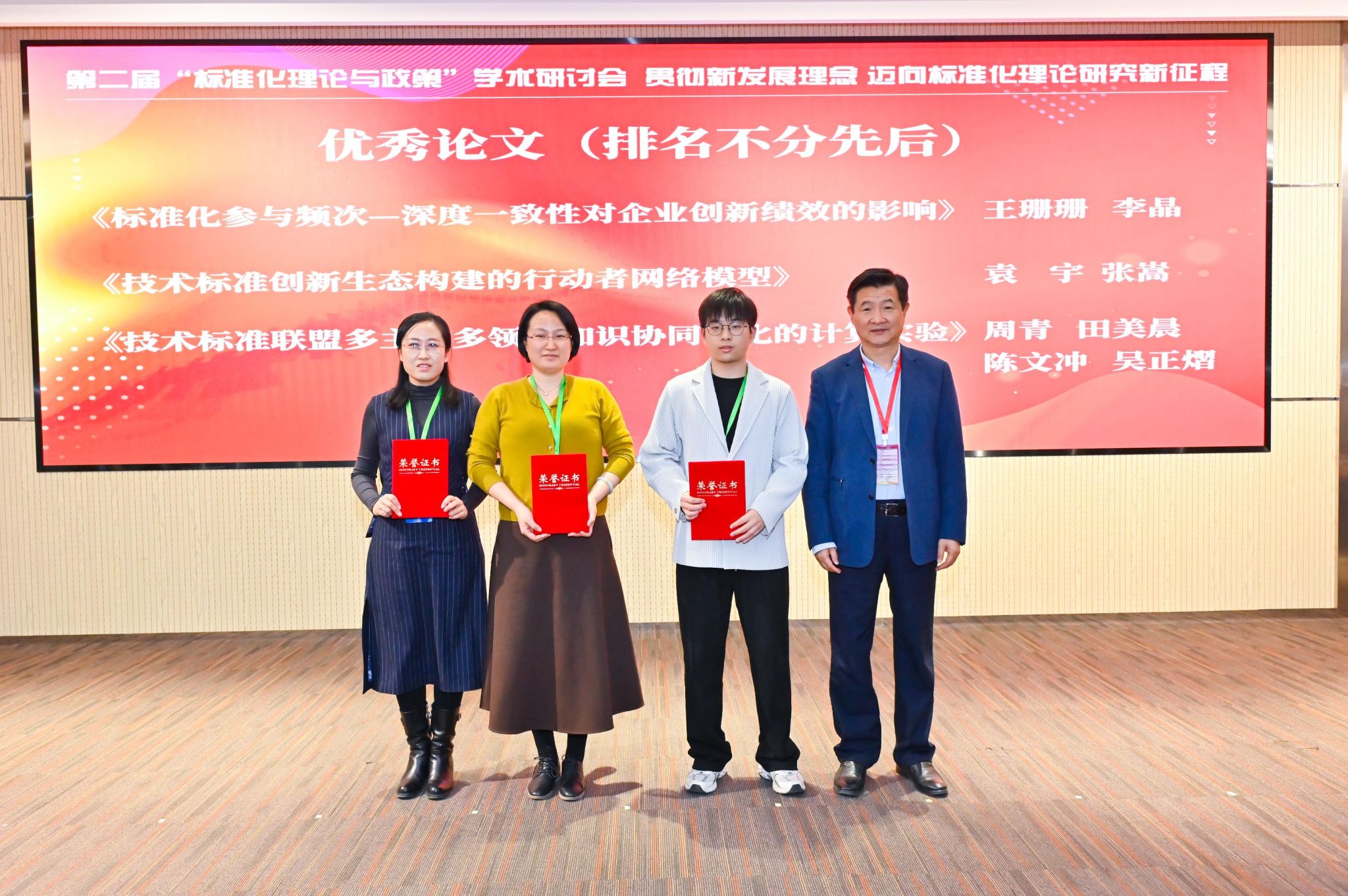 分论坛为“标准化与高质量发展”“标准化与创新”“标准化政策”三个主题。我校李凌宇、王鹤谖、刘俊杰、吴雁等同学撰写的论文在分论坛上进行报告展示,与各标准化领域专家学者进一步交流讨论。