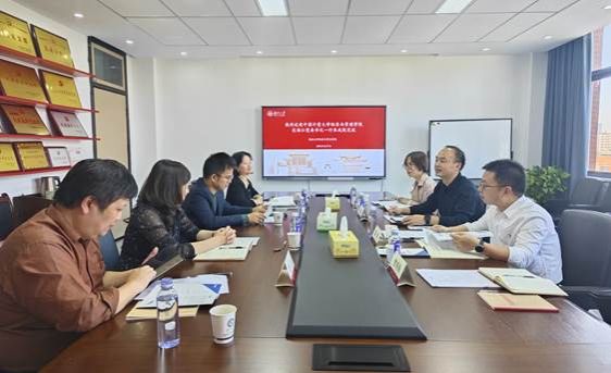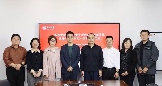 徐航天对吴海江一行的到来表示热烈欢迎,并详细介绍了学院的发展历史、师资队伍、学科建设情况。鲁丽梅重点围绕实施的党建引领、思想铸魂、协同育人、经世致用、成长生态圈“五大工程”详细介绍了学院党建的创新举措和特色做法。吴海江对湖南大学经济与贸易学院的热情接待表示感谢。 他说明了本次调研的背景和目的,介绍了经管学院的历史沿革、办学定位、学科特色、科学研究等基本情况,希望借鉴湖南大学经贸学院的经验做法,提升学院党建质量推动学院事业发展。在交流环节中,双方就党建示范创建和质量创优工作、学科平台建设、教育教学审核评估体系分解及材料准备、国际交流等方面展开了深入交流探讨。