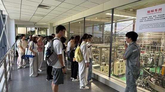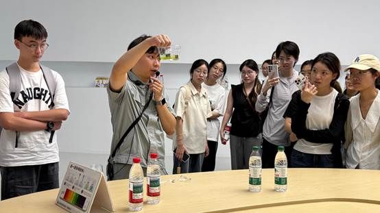 在农夫山泉建德生产基地,师生开展了丰富的生产体验活动。在企业工作人员的陪同讲解下,师生们参观了现代化生产车间,全面了解了饮用水生产的全过程,并通过企业宣传片深入感知其企业文化和发展历程。特别值得一提的是,师生们还乘船前往新安江中心水域,实地考察水源地保护实践,并品尝了直接取自江心的天然水源,聆听了“农夫山泉有点甜”“我们不生产水,我们只是大自然的搬运工”等广告语背后的企业策划和品牌文化力量以及“绿色、开放、环保、共享”等高质量发展理念。