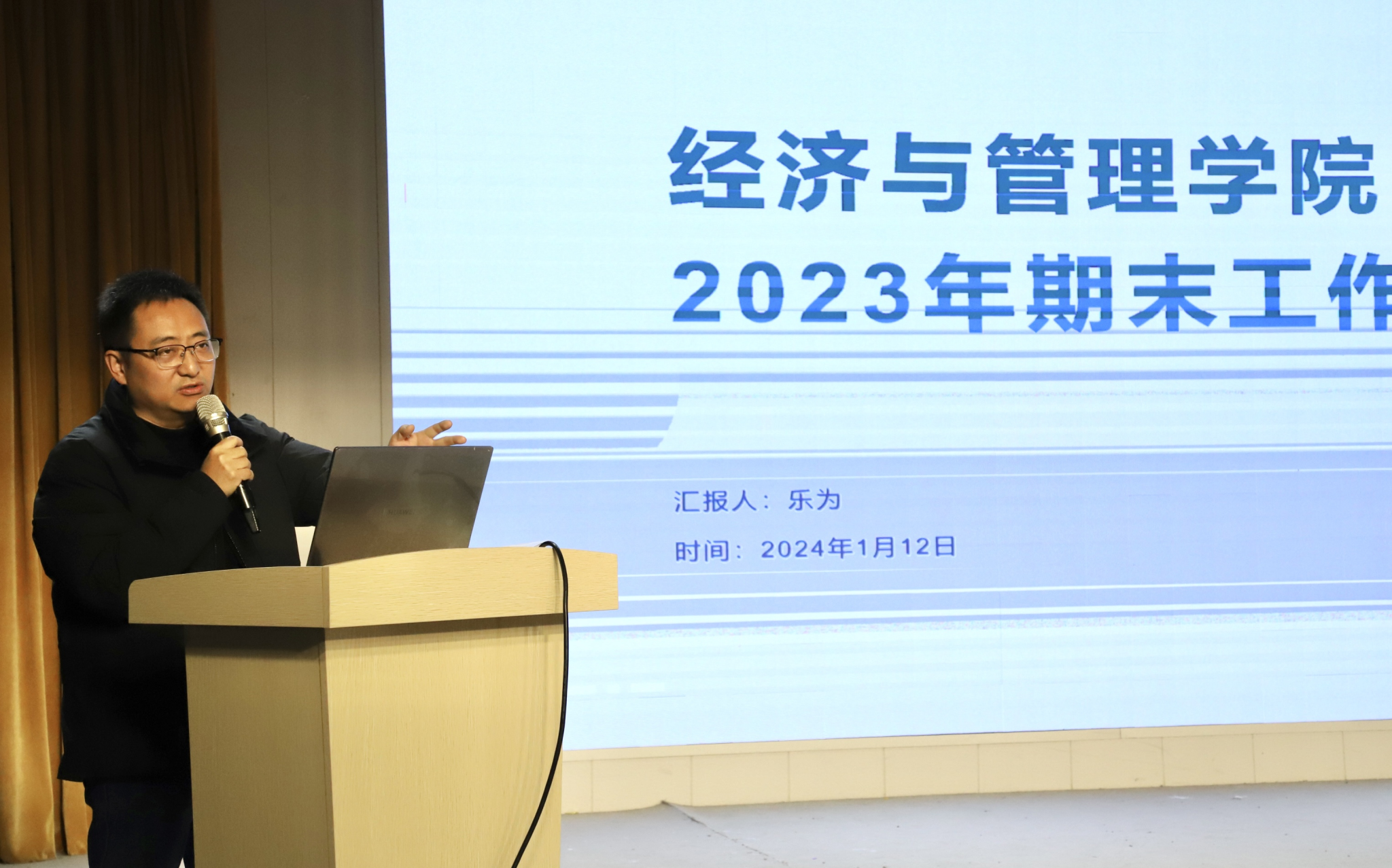 最后,乐为院长作2023年度学院总结发言,通过历年各类数据对比,肯定了学院在教学成果、科研工作、研究生工作、实验室工作、MBA建设等方面取得的工作成效,分析了学校体制改革之后学院可能在发展过程中即将面临的挑战,并提出了2024年度的工作重点。他指出,2023年工作成果主要表现在项目立项有新提升、成果产出有新突破、平台建设有新亮点。未来,学院将力争博士点和重大重点项目申报成功。