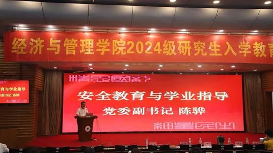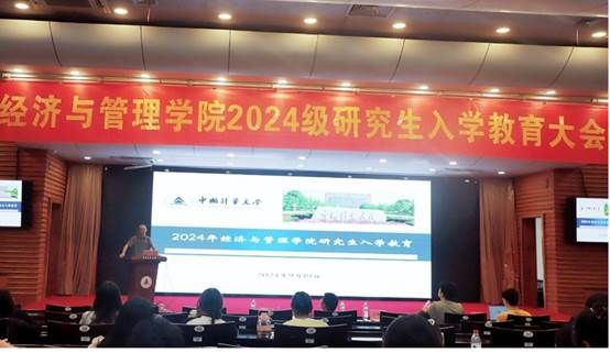山川收脚下,万卷开新篇。为帮助24级研究生尽快适应新角色,明晰规划未来发展方向,经济与管理学院于9月19日在闻厅二楼报告厅举行了研究生入学教育大会。副院长王晓军、党委副书记陈骅、党政办公室主任吴旭东、研究生辅导员汪波、研究生教学秘书周其以及24级全体研究生出席此次会议。