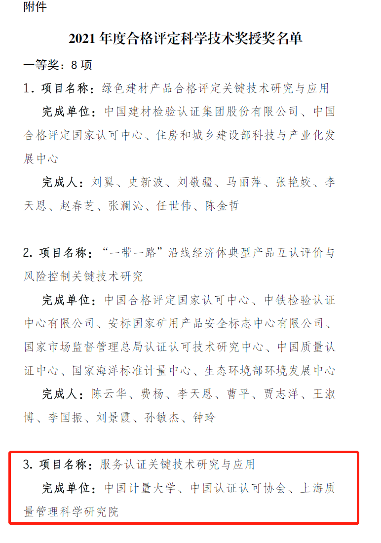 日前,2021年度合格评定科学技术奖发布授奖公告,我院乐为教授团队牵头申报的《服务认证关键技术研究与应用》获得一等奖。